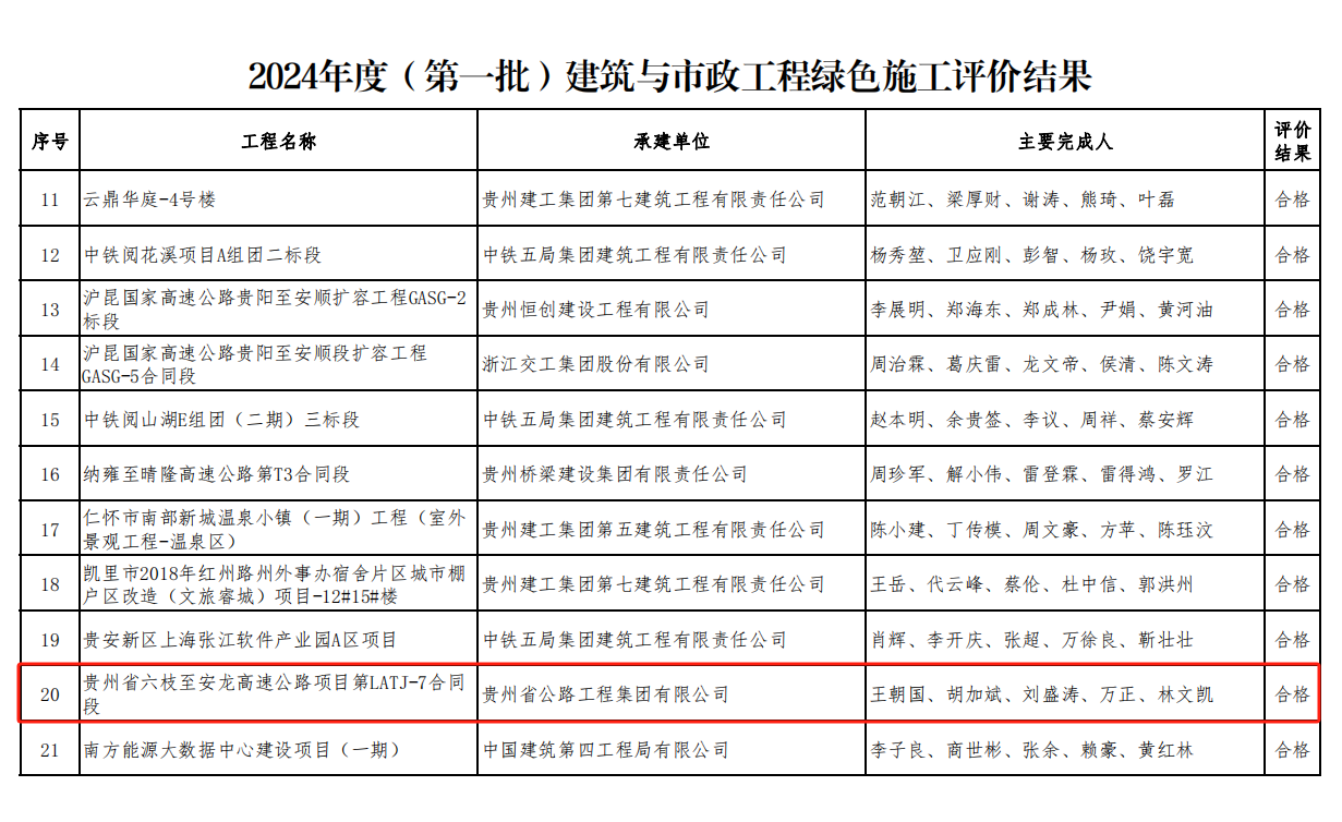近日,贵州省建筑业协会公布了“2024年度(第一批)建筑与市政工程绿色施工评价结果”,由星空平台手机版赞助塞尔塔第三工程有限公司承建的六安7标正式通过绿色施工评价。