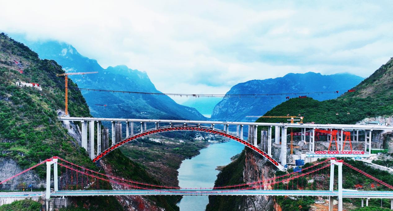 纳晴12标乌蒙山大桥为项目控制性工程,大桥左幅全长491.5米,右幅全长511.5米,主桥结构为270米钢桁腹杆-混凝土组合拱桥,建成后将成为世界首座大跨度装配化钢桁腹杆—混凝土组合拱桥,目前大桥建设进度已超90%。
