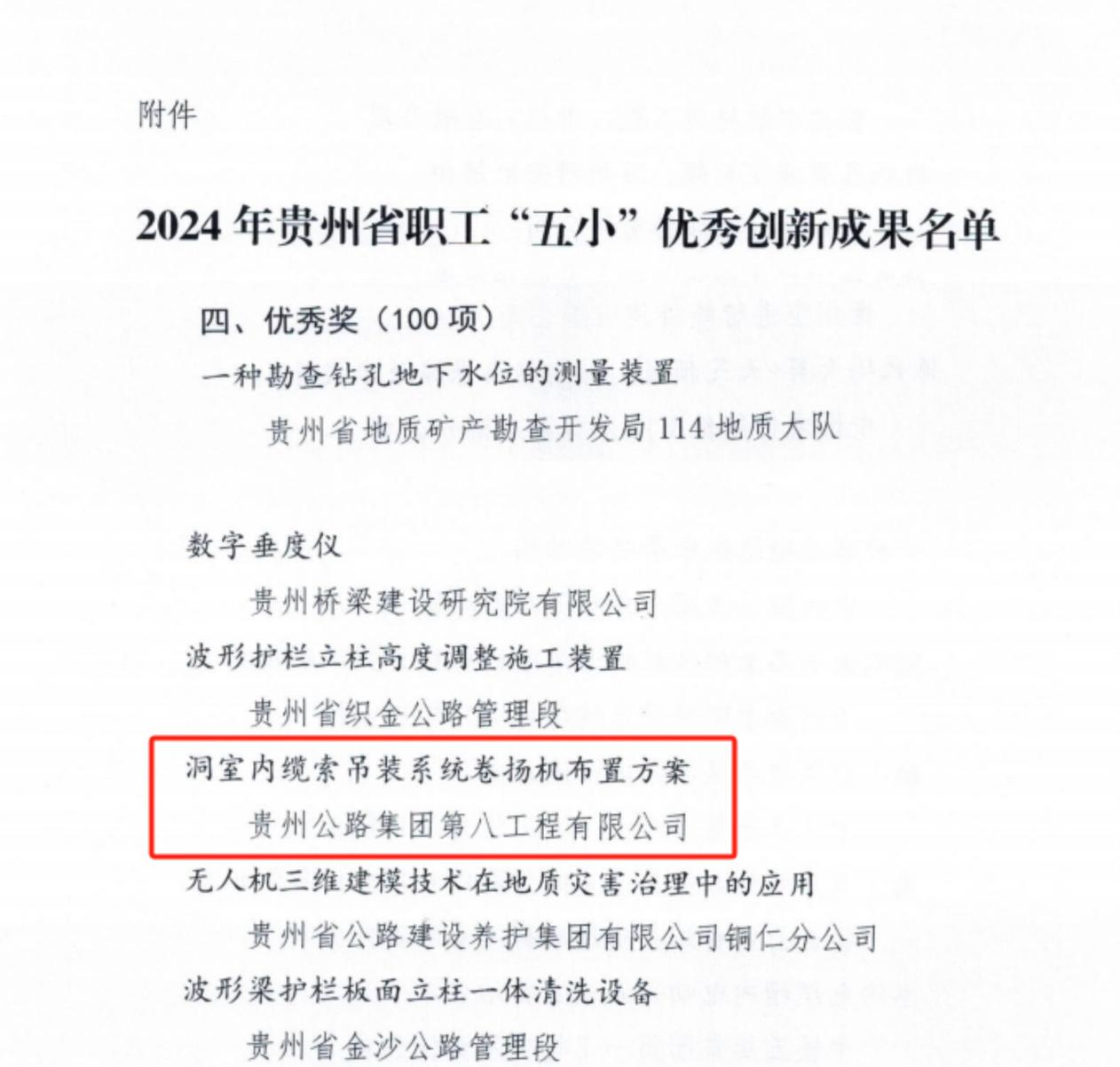 近日,贵州省总工会、贵州省科学技术协会、贵州省质量协会联合发布了2024年贵州省职工“五小”优秀创新成果名单,由星空平台手机版赞助塞尔塔第八工程有限公司申报的《洞室内缆索吊装系统卷扬机布置方案》获得优秀奖。