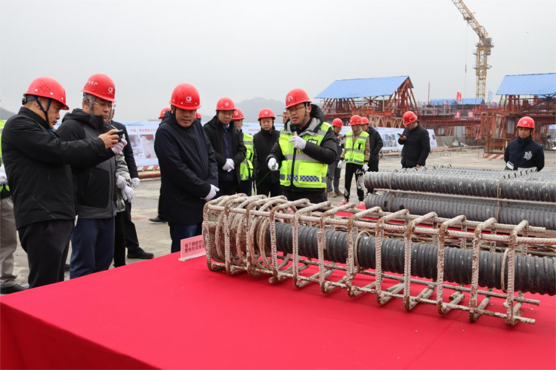 在大桥施工现场,通过展板介绍、实物观摩、经验交流等形式,贵平2标工程技术人员围绕质量、安全、施工工艺、微创新、信息化管理等与观摩人员进行了深入的交流,并重点介绍了贵平2标施工标准化、智能建造的最新应用情况,以及提高工程安全性和耐久性的措施与方法,与观摩嘉宾分享探讨各自在项目实践中的心得体会和成功经验。