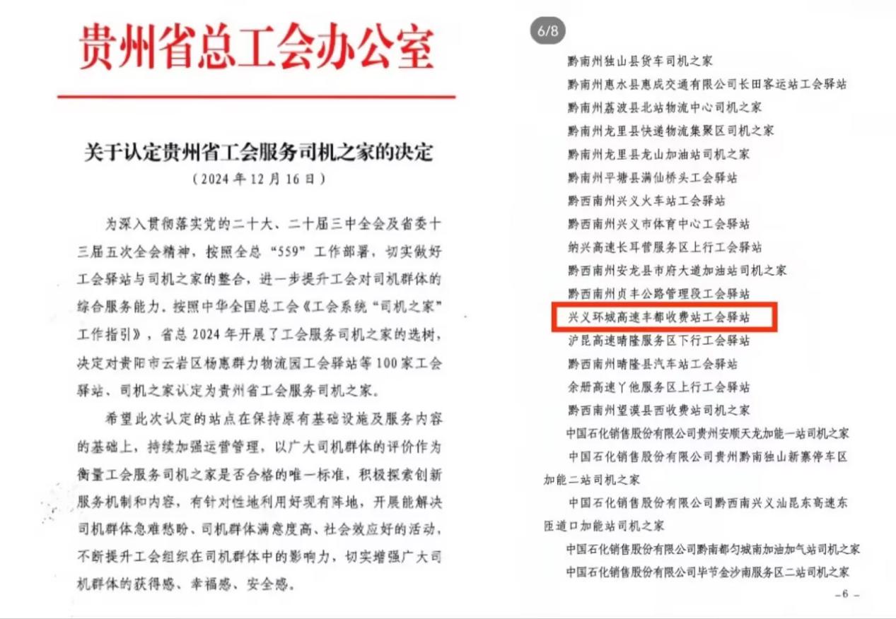 近日,省总工会公布了2024年贵州省工会服务“司机之家”名单,兴义环高公司工会精心打造的“心光驿站”顺利通过认定。