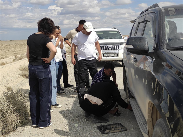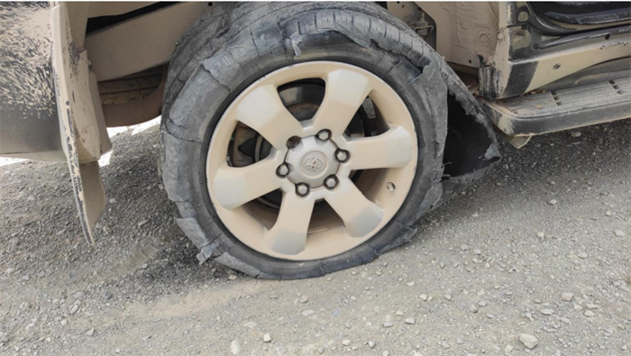 去程的砂石路磕磕绊绊,车比人更先撑不住了,只听“嘭”的一声,车身剧烈地摇晃起来,我们赶紧下车查看情况。只见车胎表皮七零八碎,破破烂烂,彻底宣告它就地“退休”!