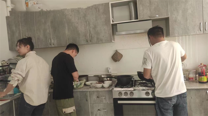 周末,我们一同做了一顿大餐,从家乡带来的腊肉、香肠、辣子鸡等特产发挥了它们最大的价值,缓解了一丝项目部同事们对家乡的思念之情。应是做惯了,他们分工有序,洗菜、切菜、炒菜……“周末的美食节目是我们为数不多的娱乐活动。”项目部的同事说。厨房里的烟火气与笑声组成了他们特别的休闲放松空间。
