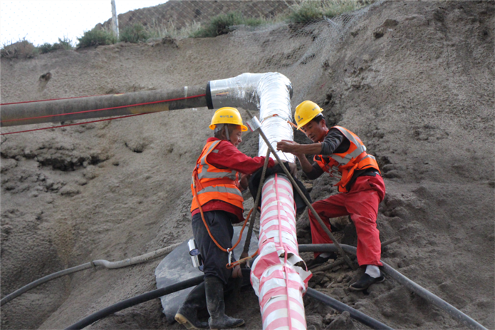 在布然隧道进口处,我们看见工人们正在用伴热带、保温棉、铝箔纸包裹管道。项目总工郭步玺看我一头雾水,便解释道,布然隧道隧址处于高寒、高海拔地区,每年有效施工时间仅有3月初至10月底的8个月时间,进入冬季后,室外的大桥、路基等就不具备施工条件了。但是项目部通过增加保温措施,能够克服恶劣天气带来的影响,从而继续进行隧道施工。