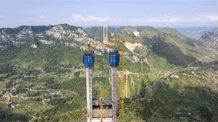 炎炎夏日,被称为“地球裂缝”的花江大峡谷,5号主塔正在加紧建设中。数台塔式起重机高高扬起金黄色手臂,助力六枝岸5号主塔塔柱、横梁施工建设。这是花江峡谷大桥的最高索塔,设计塔高262米,相当于80多层楼房高度。今年3月以来,它正以平均每天0.8米的速度向上“生长”。