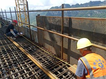 数台塔式起重机插入云霄,意味着600多米的深谷,262米的高塔又将创造另一个北盘江奇迹。高塔的腰部正在施工着关键工程部位--下横梁,工人们正在争分夺秒的安装着预埋件,配合着测量员精准的放样,将误差控制在允许误差范围内,展示了公司追求高精度,高品质的质量工程。下横梁作为5号主塔的主要结构部位,三阶段在项目部管理人员及施工队务24小时加班施工中于8月12日完成浇筑,意味着下横梁施工将告一段落。